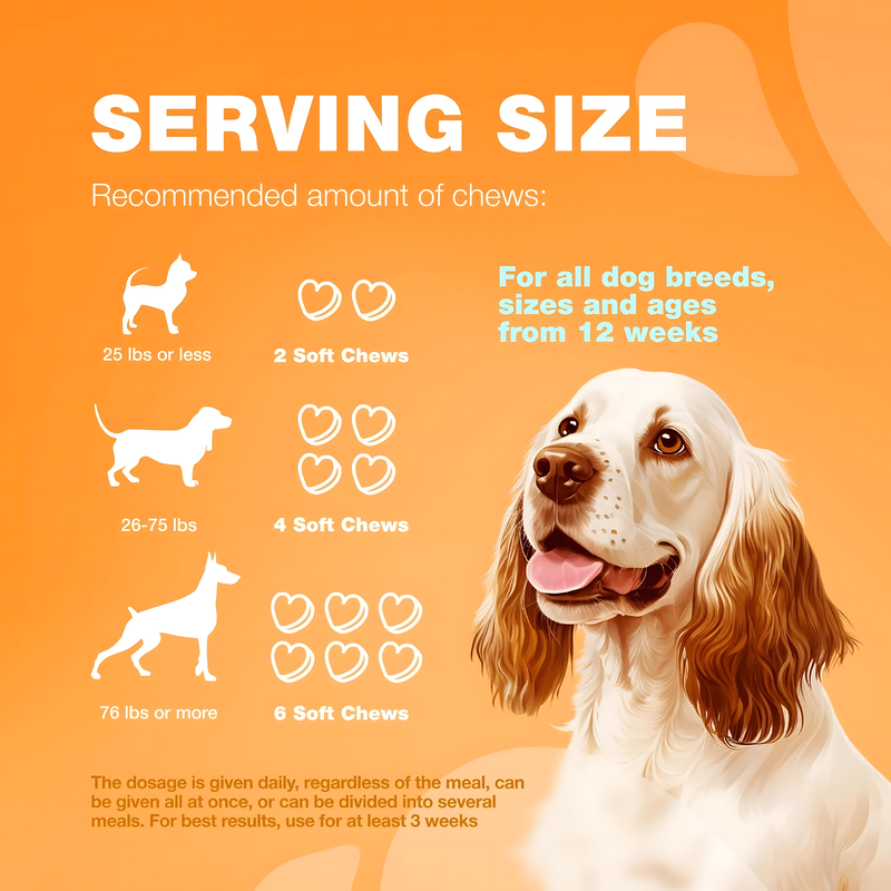 Suitable for all breeds, sizes, and ages from 12 weeks. The dosage can be given all at once or split into multiple meals. For best results, use consistently for at least 3 weeks.